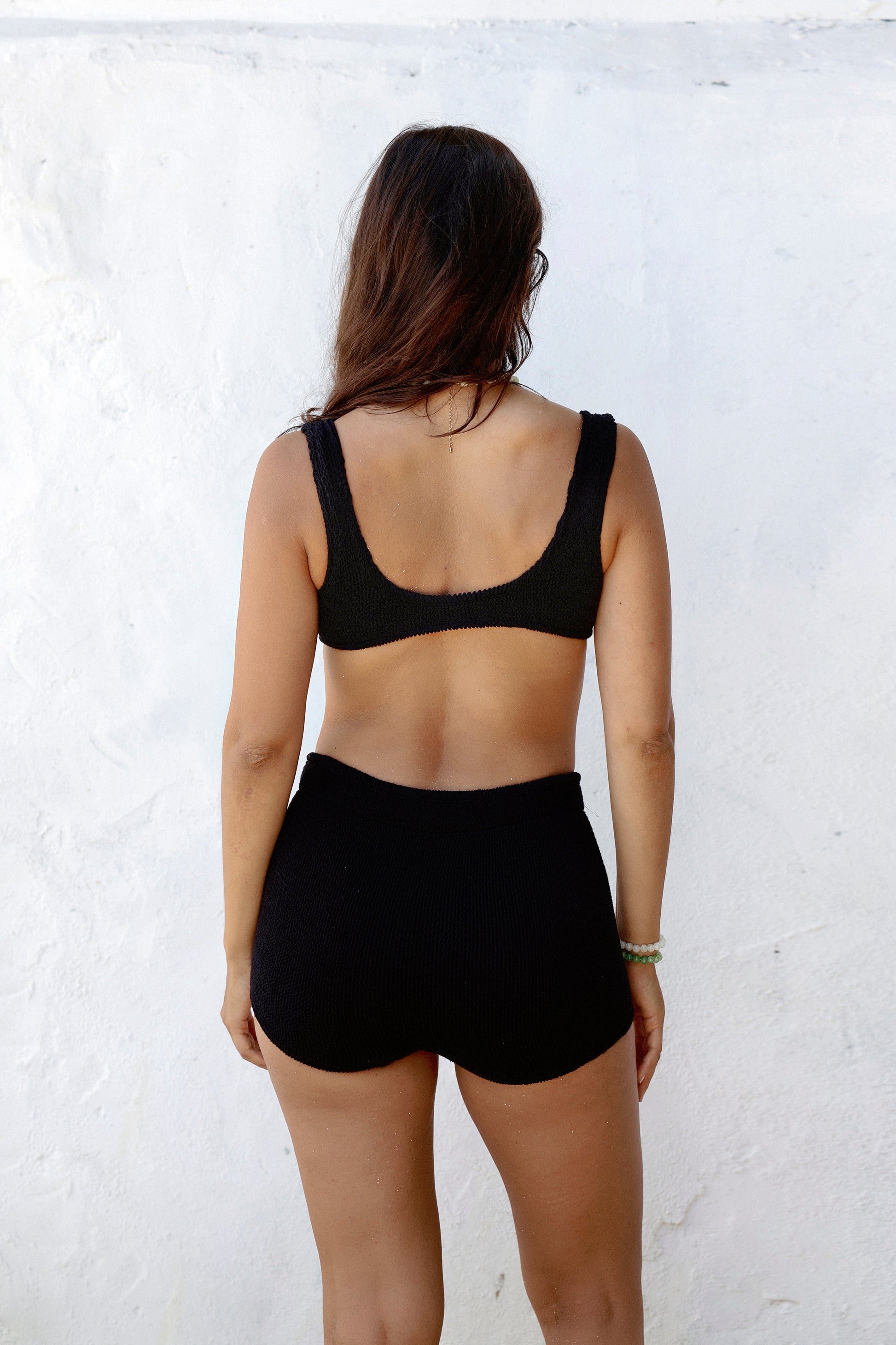 Recycled Nylon 92% Elastane 8%. Delicate knitted fabric. Avoid direct contact with sand or rough surfaces